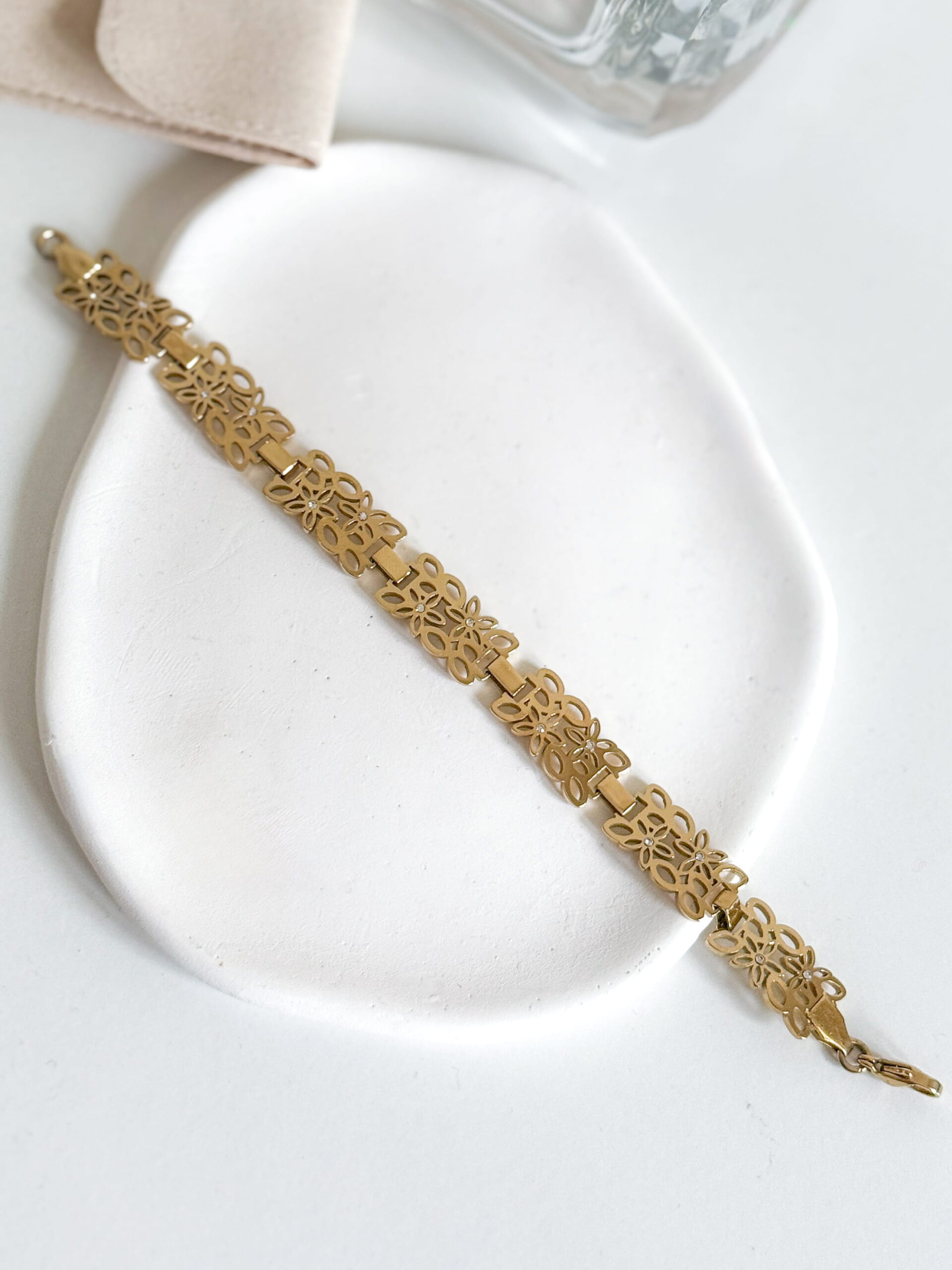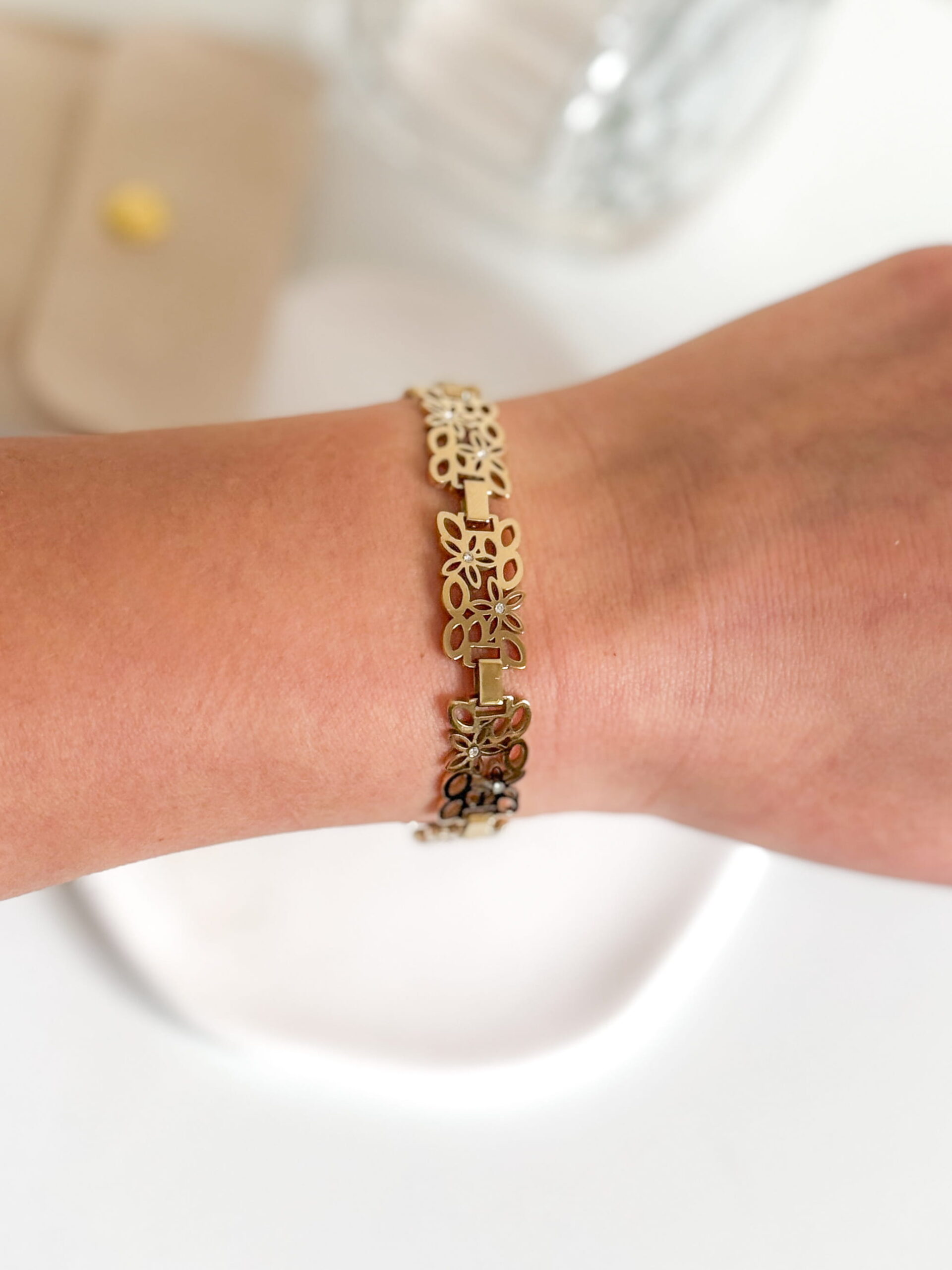 Bransoletka szeroka ażurowe kwiaty z pojedynczymi cyrkoniami. Zapięcie karabińczyk.