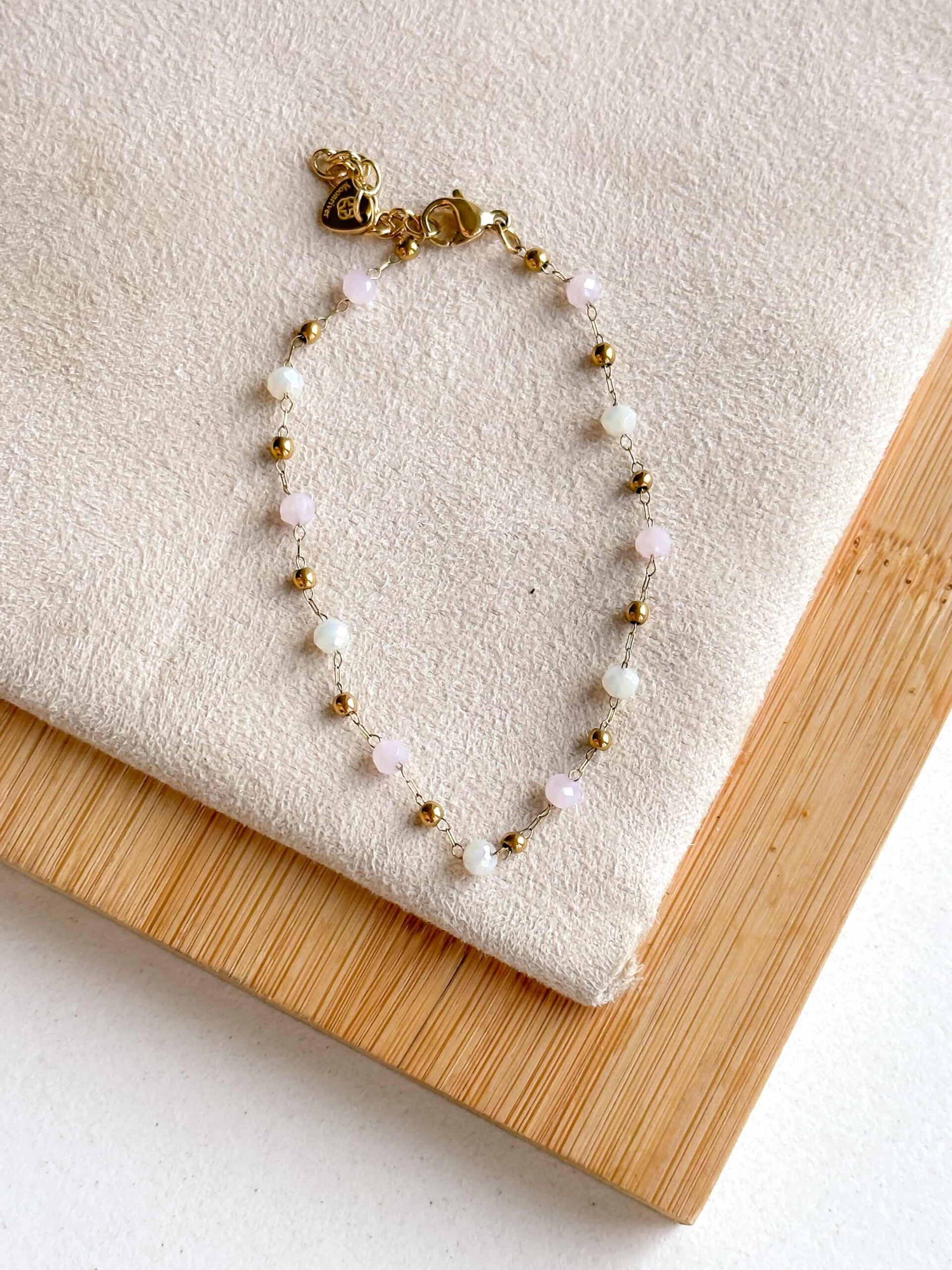 Bransoletka z białych, różowych i złotych koralików. Oprawa i zapięcie łańcuszka w kolorze złotym.