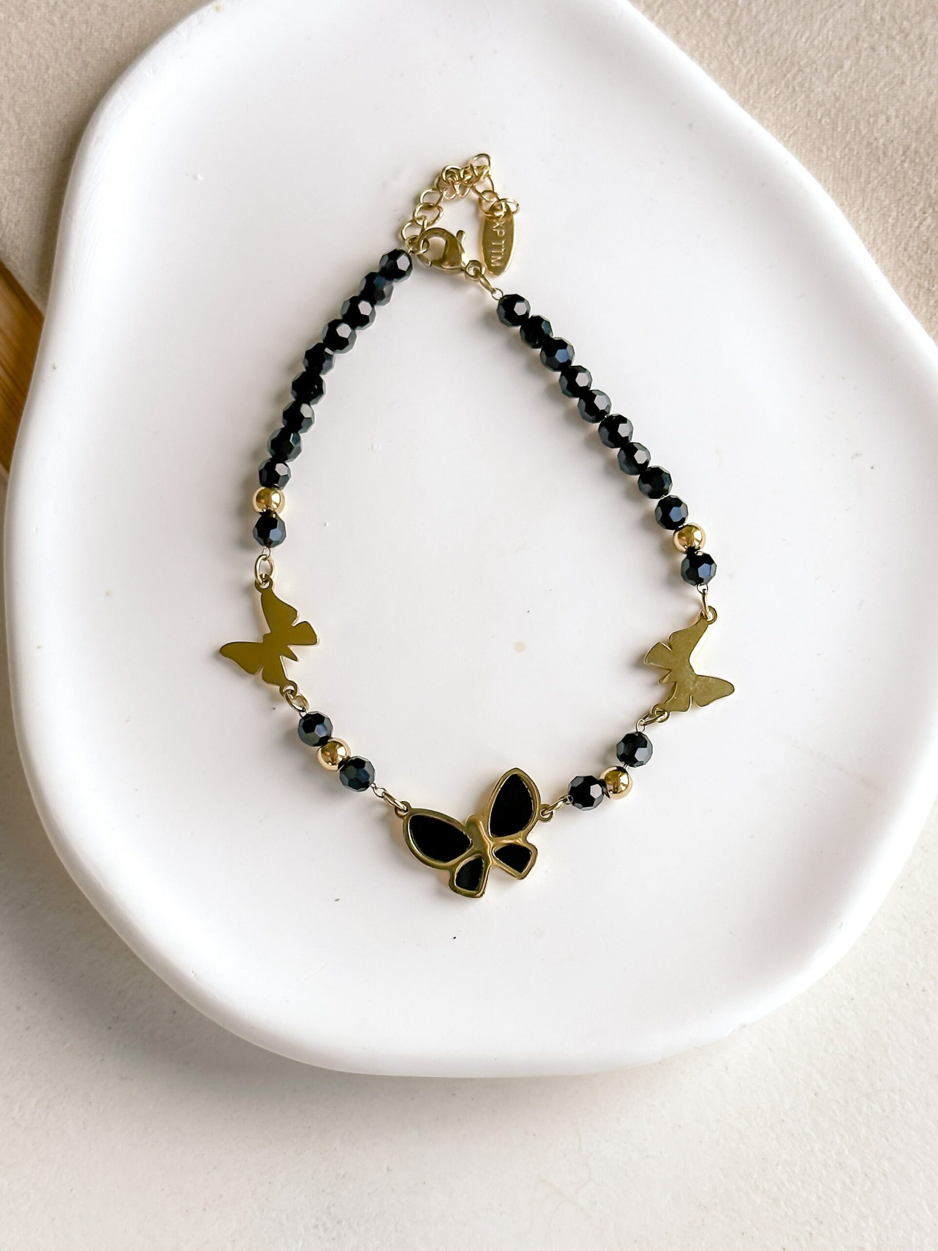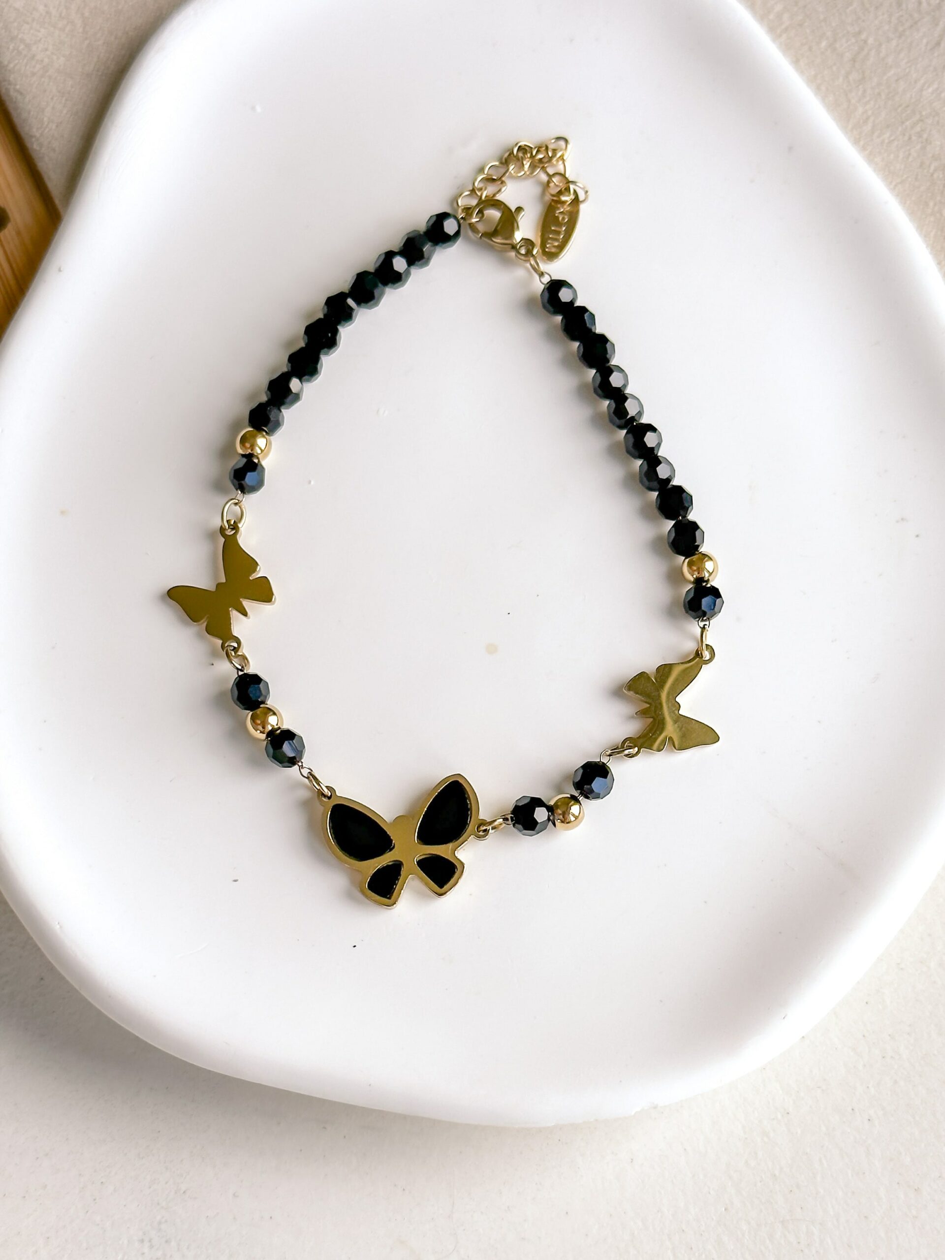Bransoletka z czarnych koralików z zawieszkami dwoma gładkimi motylami i większym motylem z czarnym emaliowaniem, oprawa w kolorze złotym. Stal chirurgiczna 316L