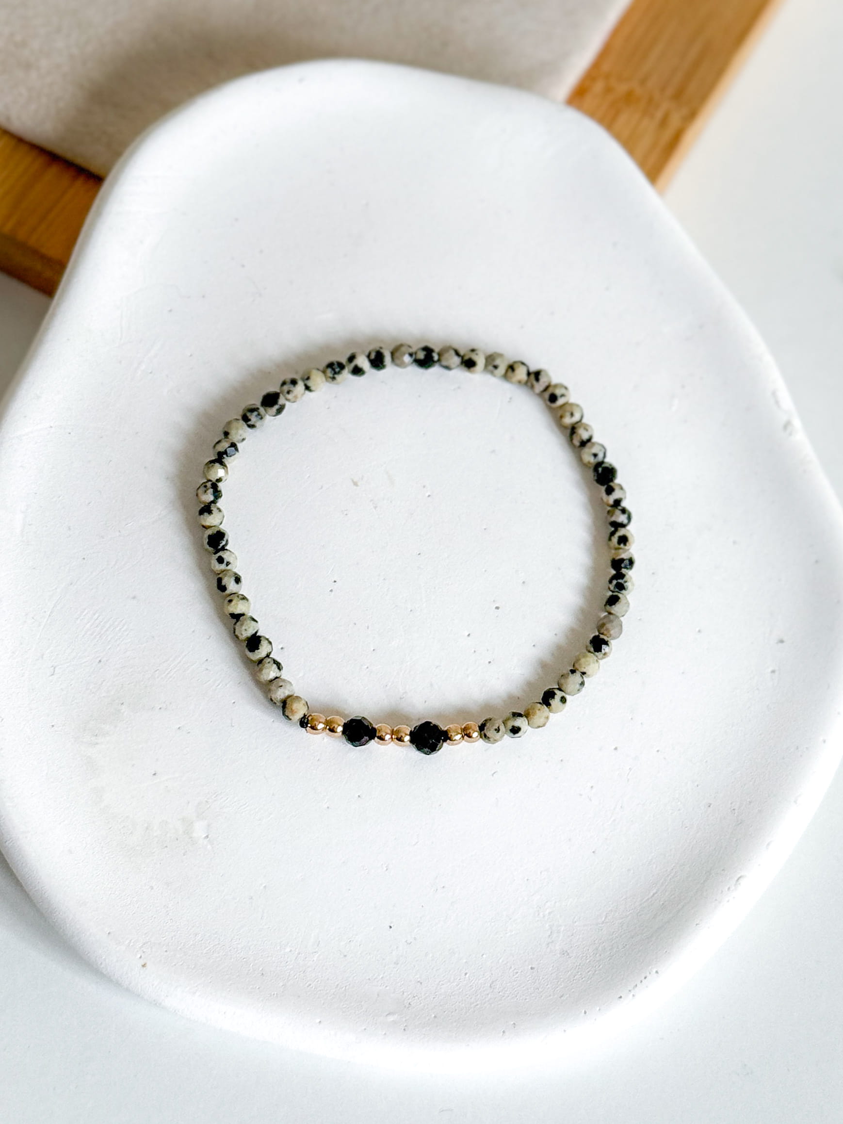 Bransoletka na gumce ręcznie wykonana z kamieni fasetowanych jaspisu dalmatyńskiego z dodatkiem turmalinu czarnego i kulek w kolorze złotym.