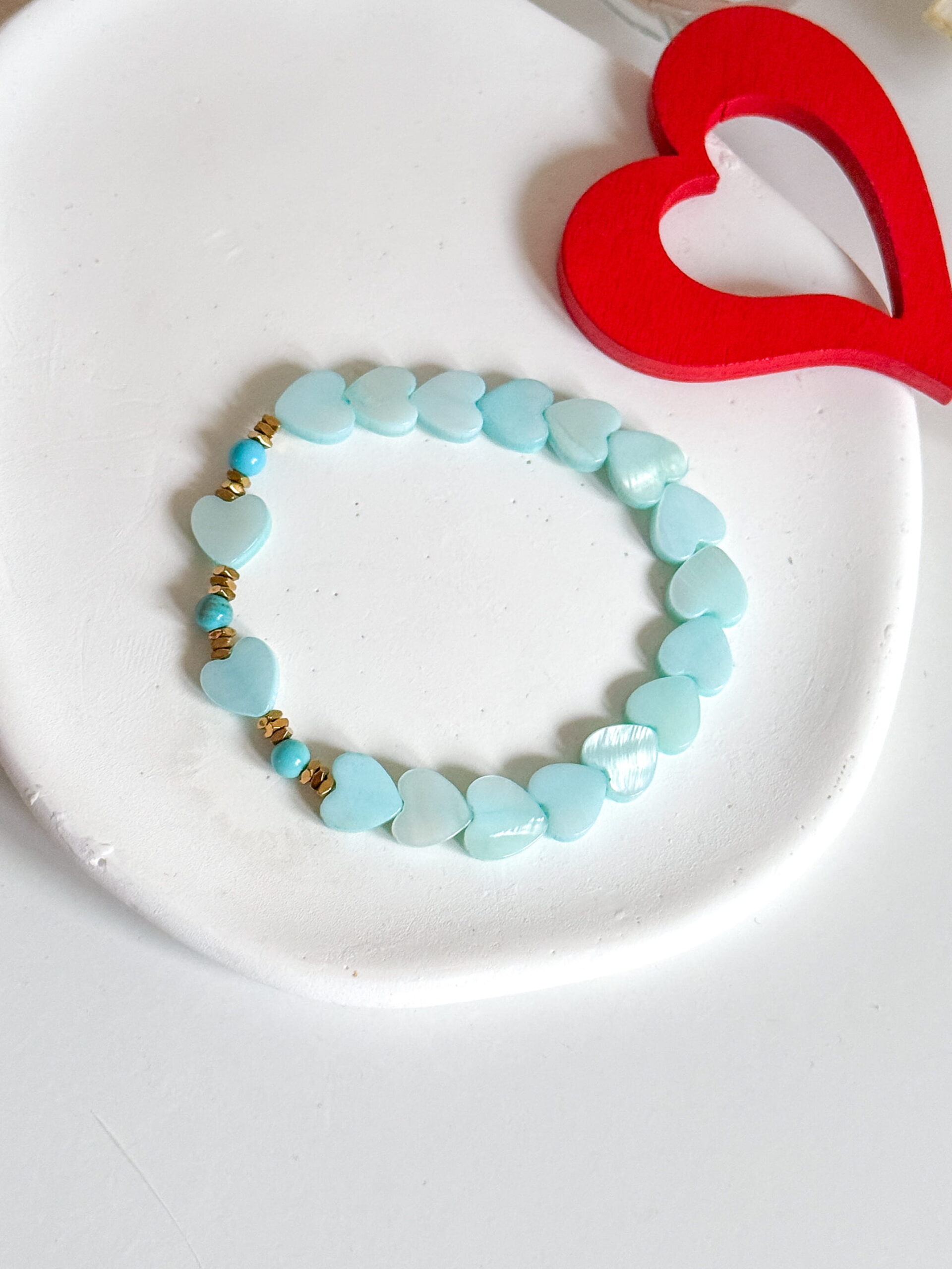 Bransoletka na gumce serca masa perłowa błękitne turkus