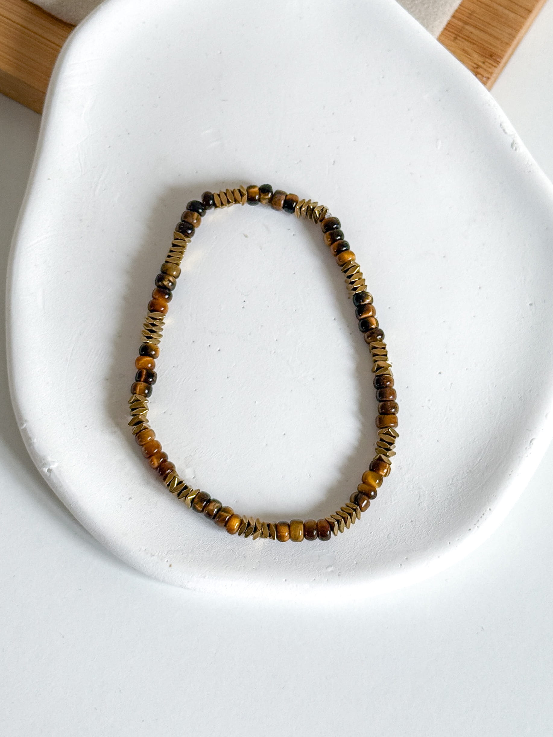 Bransoletka na gumce z kamieni tygrysiego oka, a także złotych przekładek ze stali w kolorze złotym.
