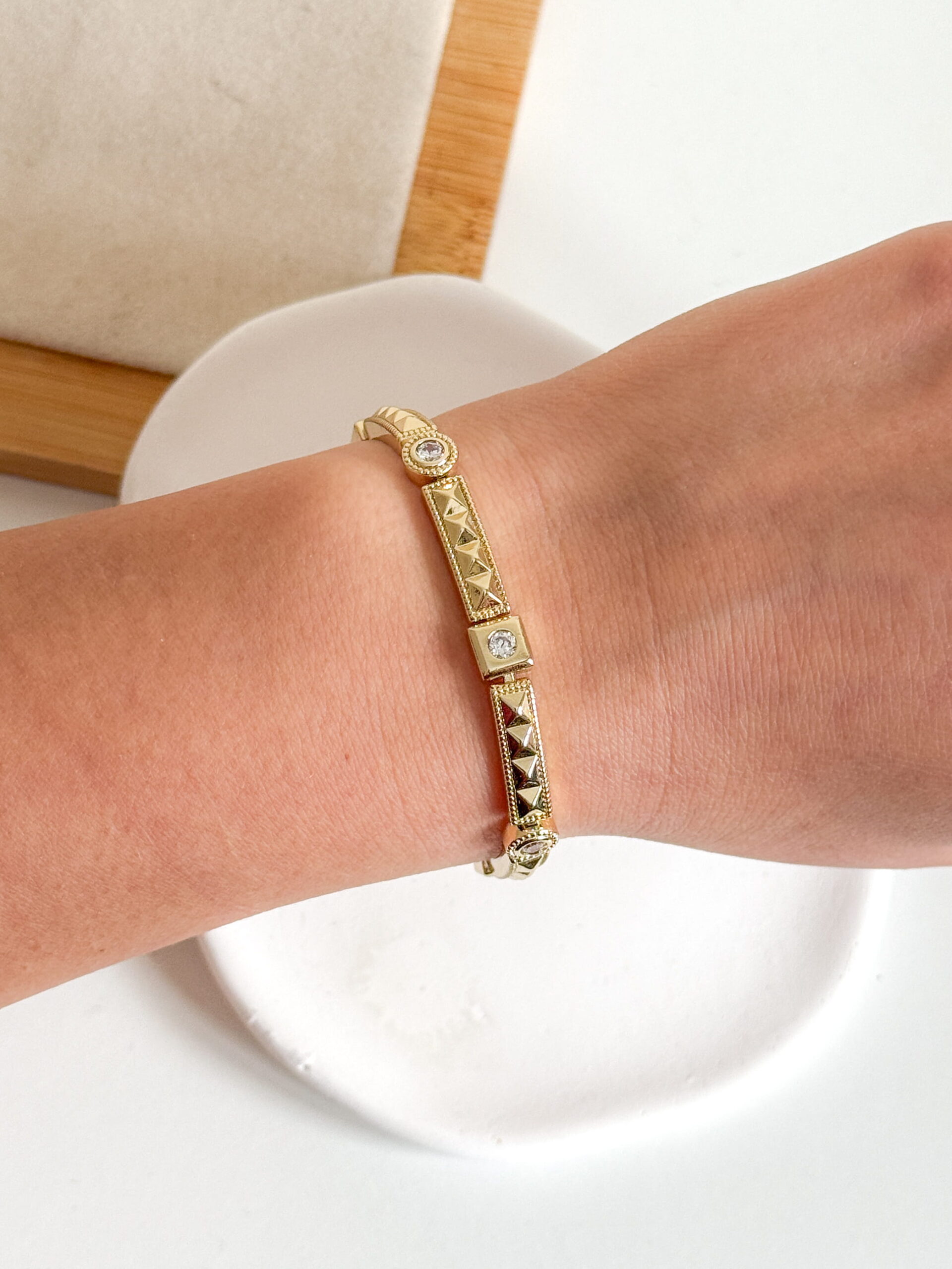 Pozłacana bransoletka ze stali chirurgicznej z kryształkami, w kolorze złocenia 14K (żółte złoto). Zapięcie zatrzask.