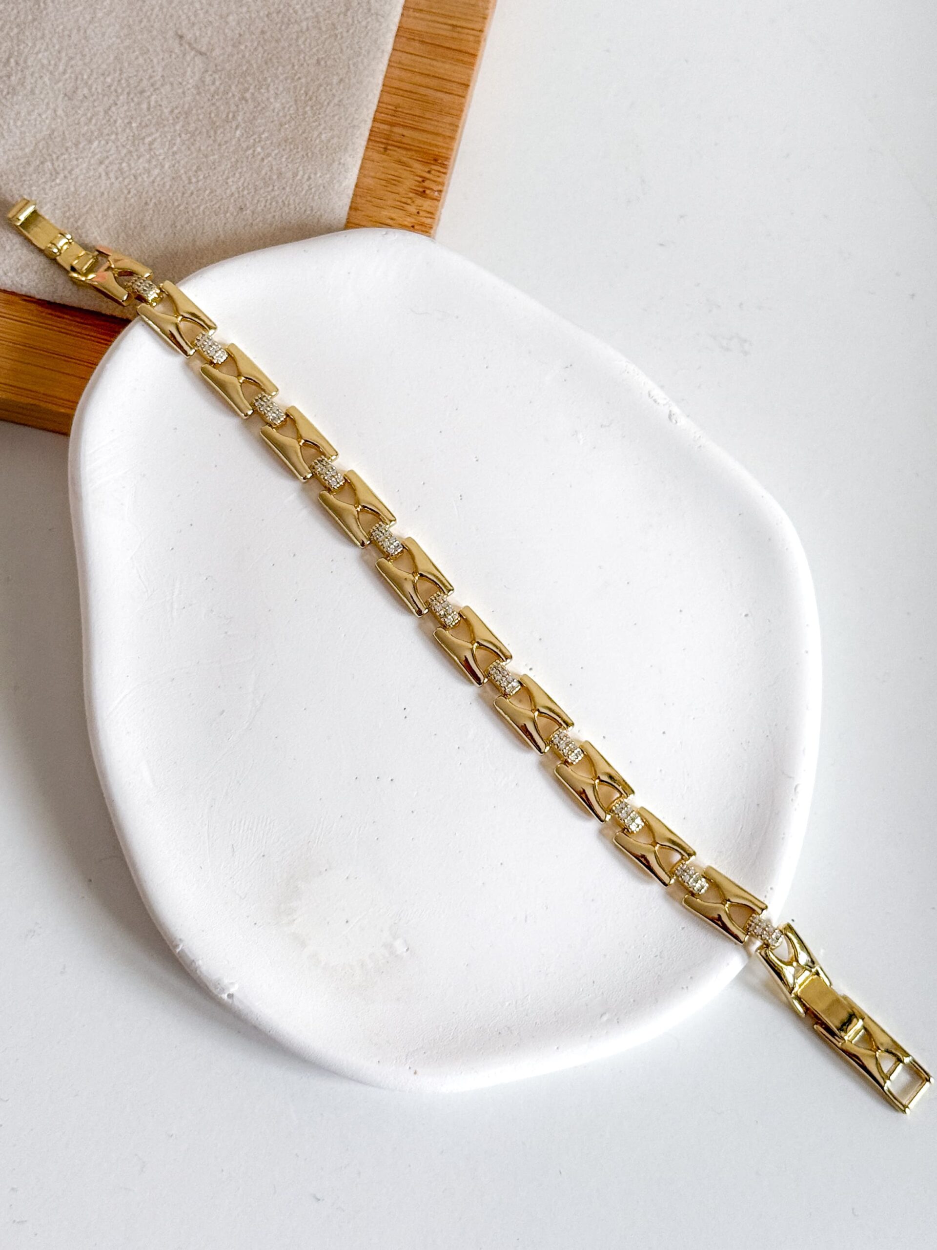 Pozłacana bransoletka ze stali chirurgicznej z cyrkoniami, w kolorze złocenia 14K (żółte złoto). Zapięcie zatrzask.