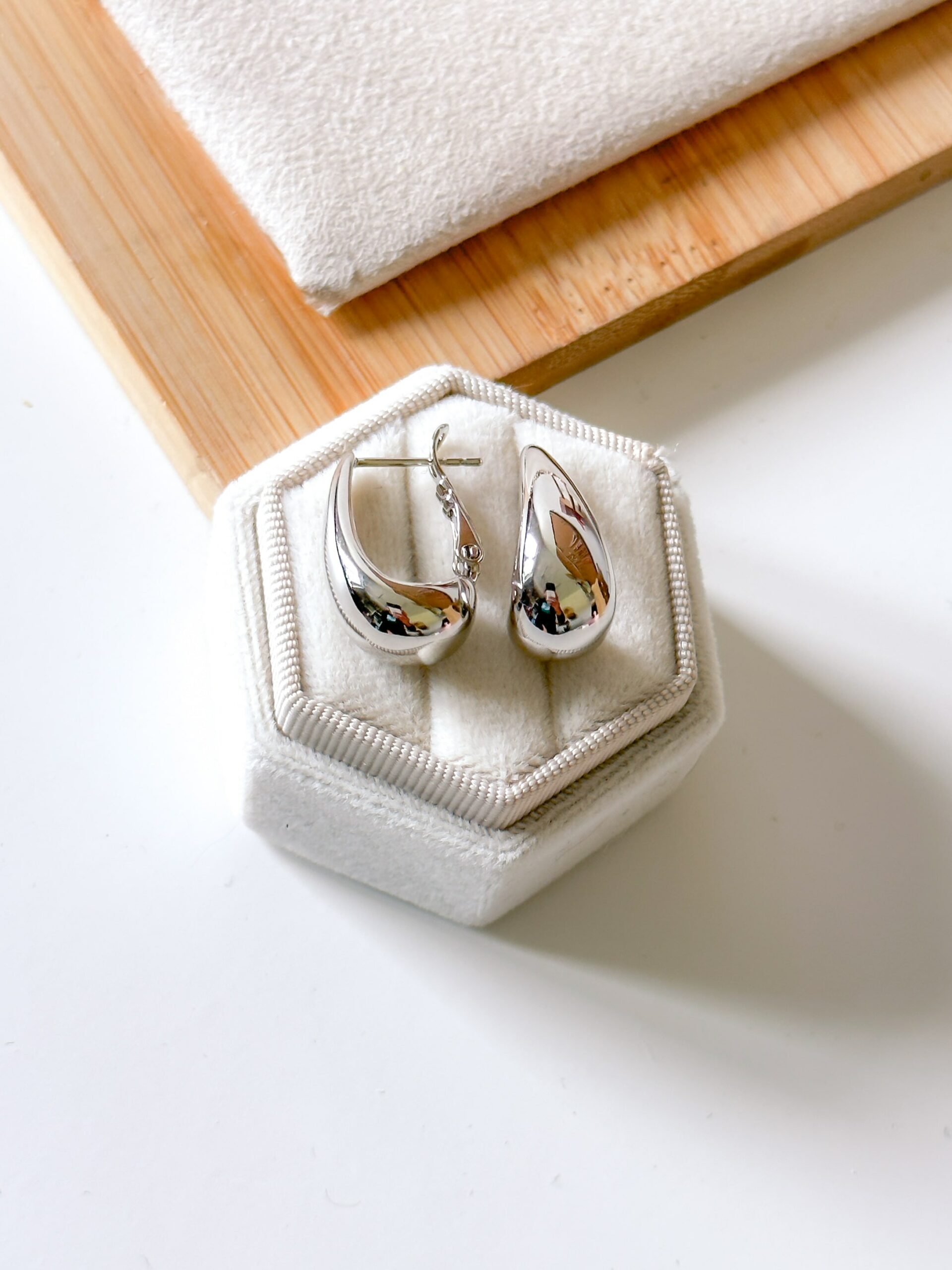 Kolczyki bowl grube łezki w kolorze srebrnym. Zapięcie na zasadzie klipsa, automatyczne na wkrętkę.