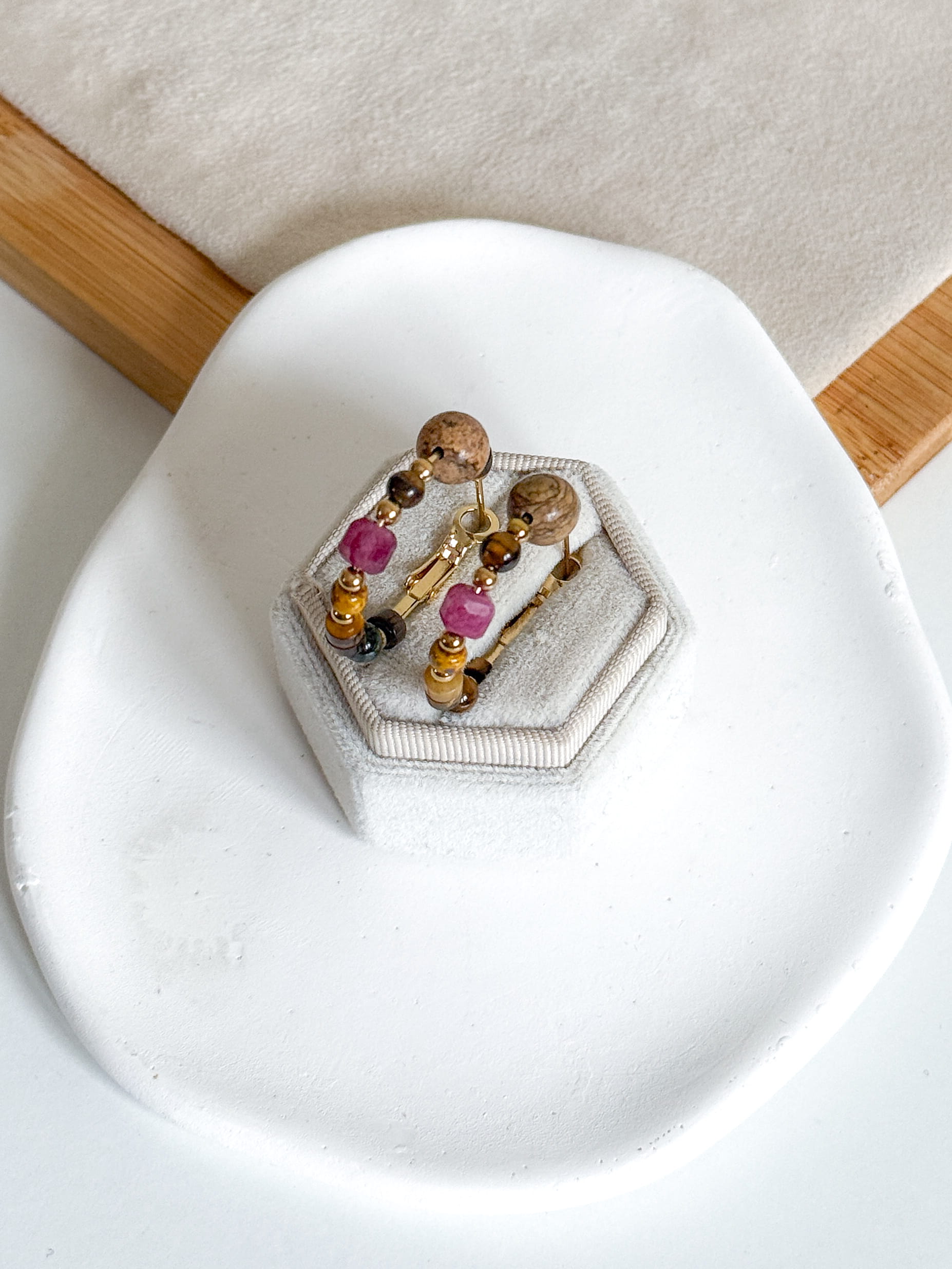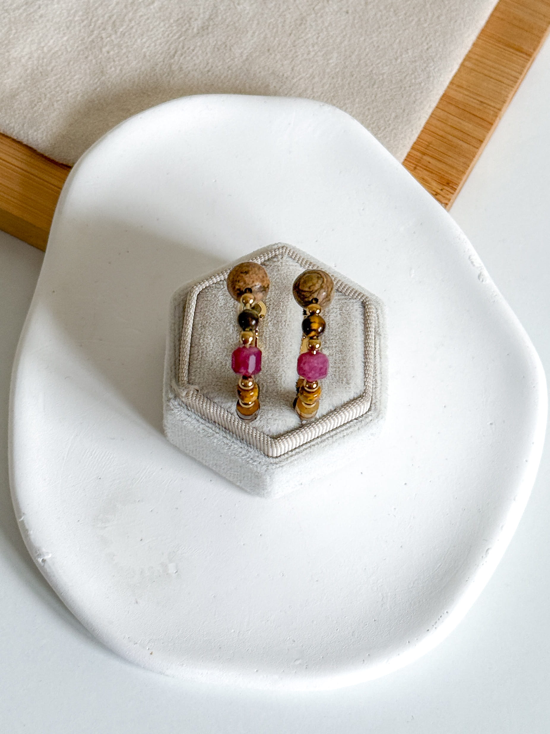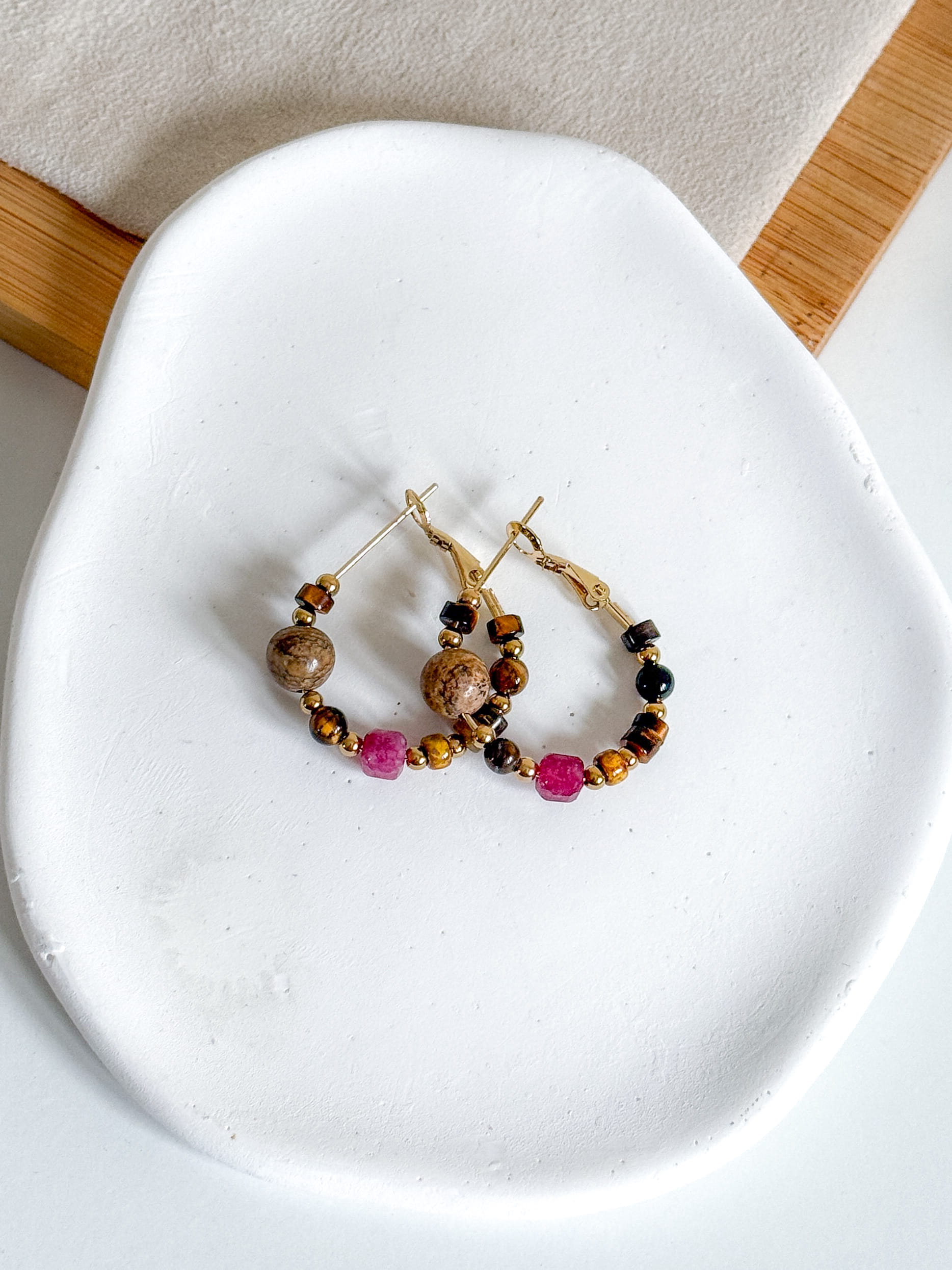 Kolczyki kółka z kamieniami: jaspis cesarski, agat, tygrysie oko.