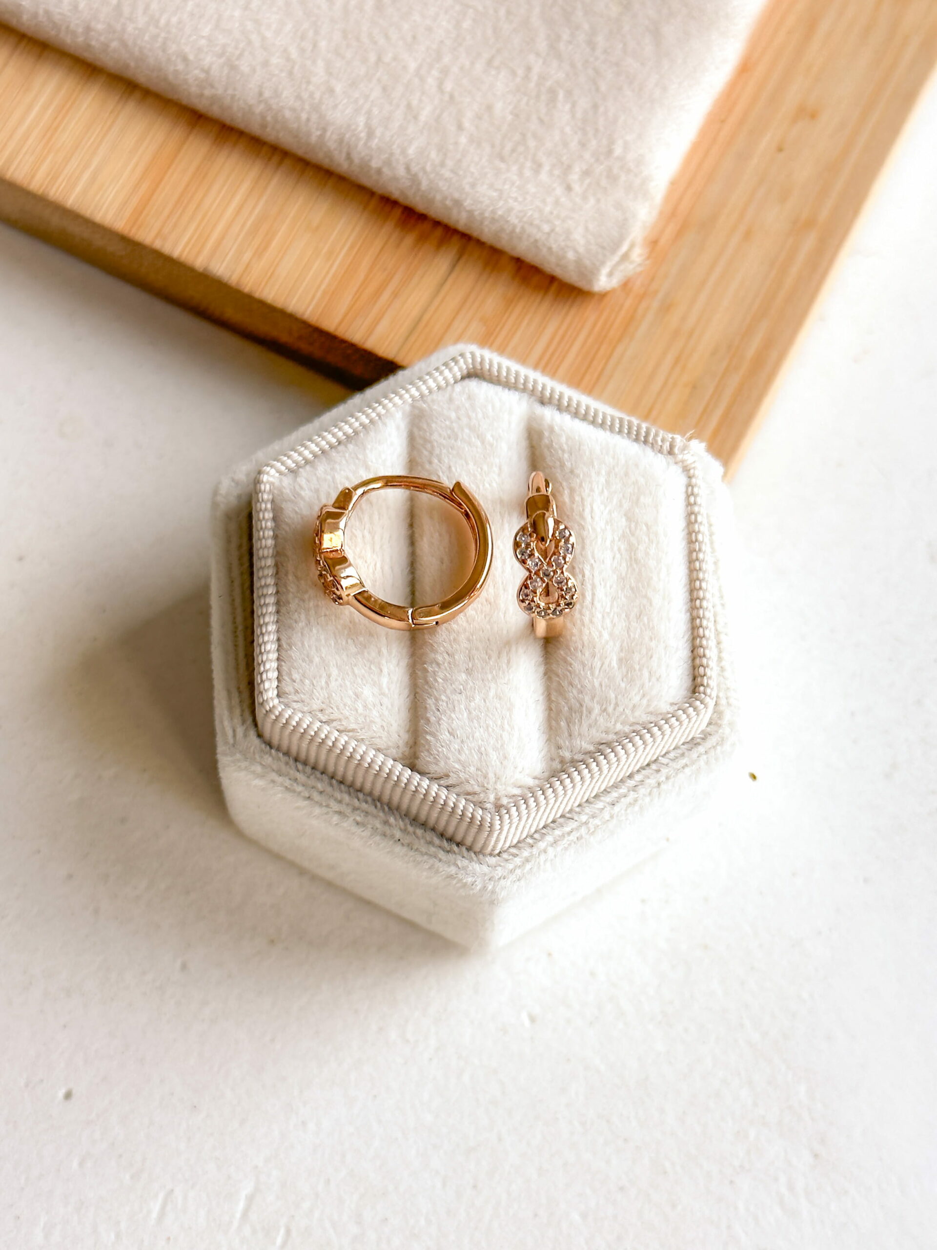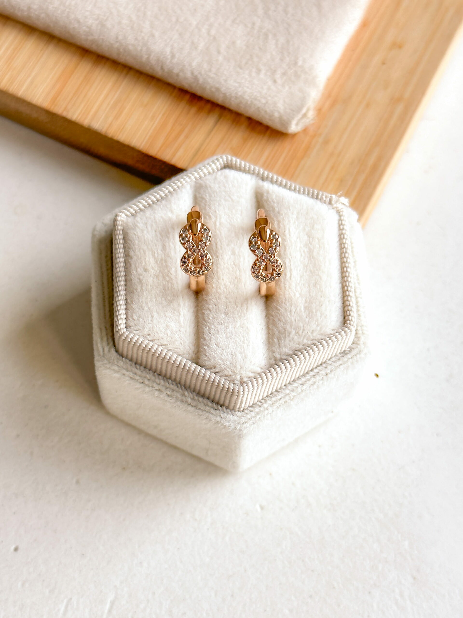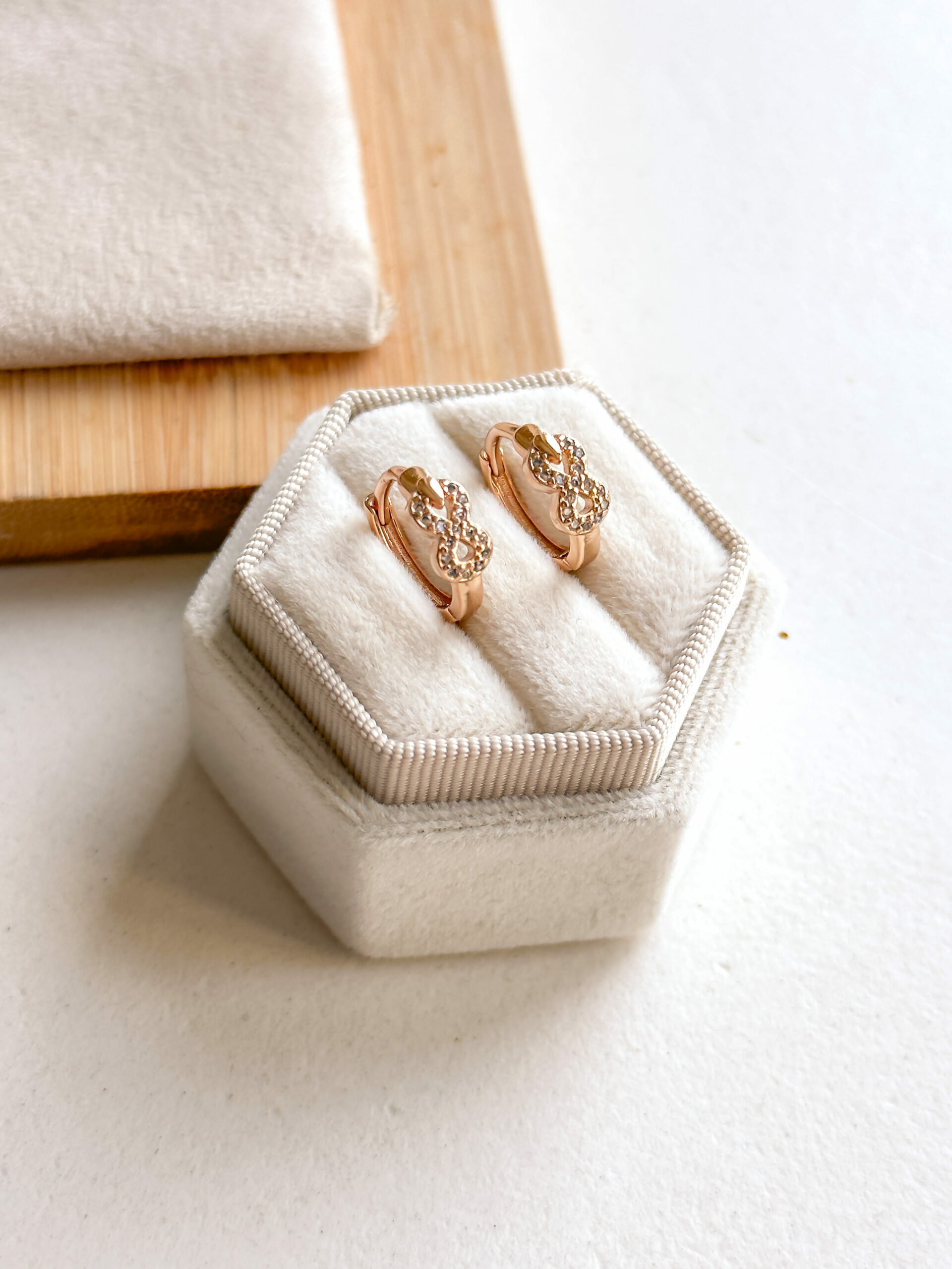 Pozłacane kolczyki ze stali chirurgicznej, małe kółka z nieskończonościami w cyrkoniach. Zapięcie angielskie, na zatrzask.