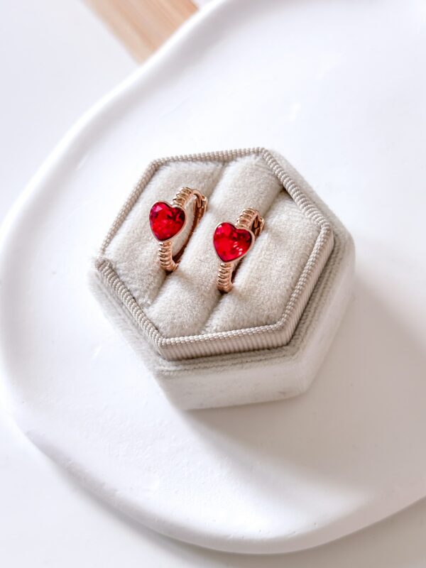 Pozłacane kolczyki 18K ze stali chirurgicznej, kółka z sercem kryształ Swarovski w kolorze light siam. W kolorze złotym. Zapięcie angielskie, na zatrzask.