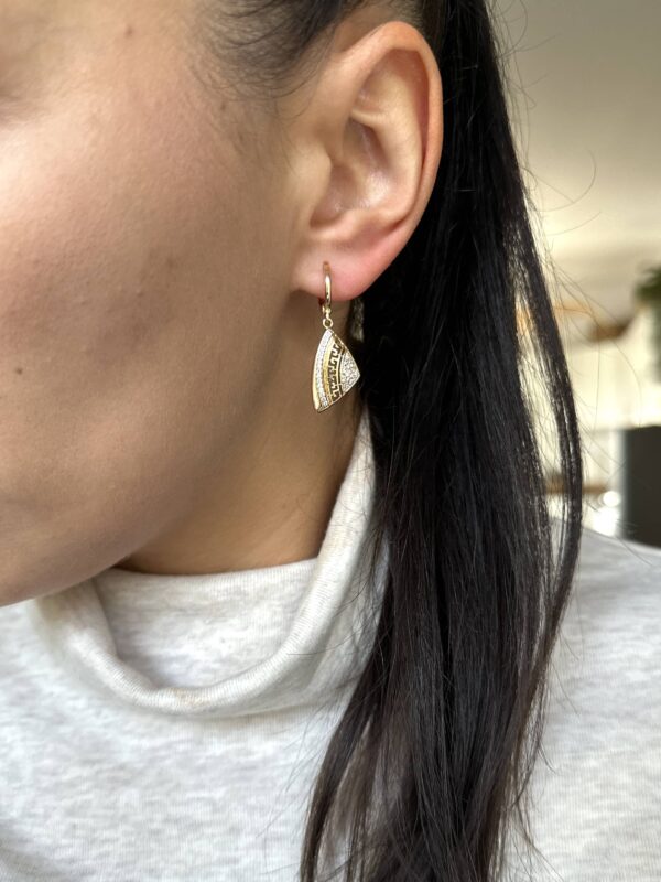 Pozłacane 18K kolczyki ze stali chirurgicznej, wiszące trójkąty z greckim wzorem i cyrkoniami. Zapięcie angielskie na kółku.