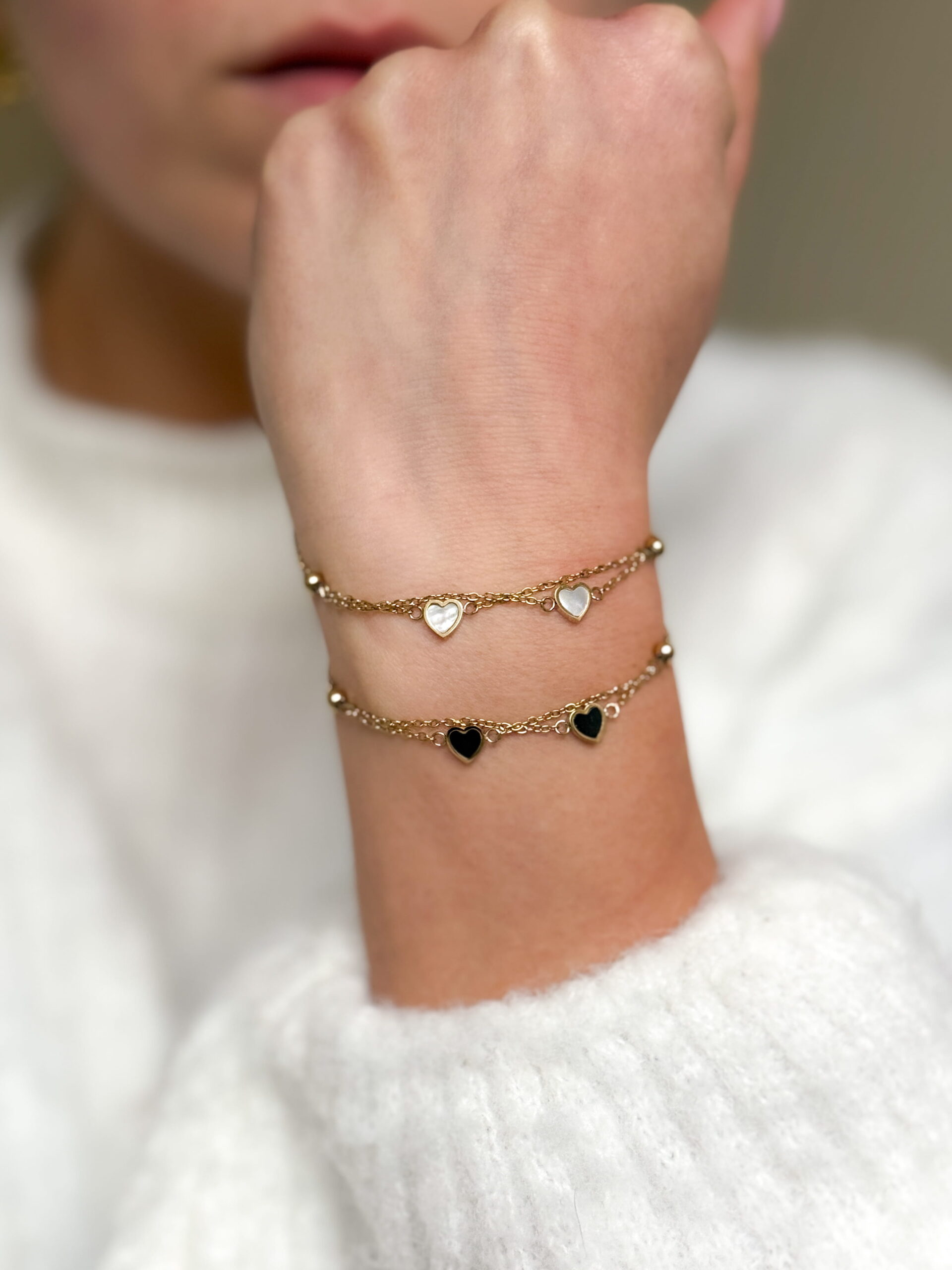 Bransoletka celebrytka dwa serca masa perłowa. Zapięcie karabińczyk.