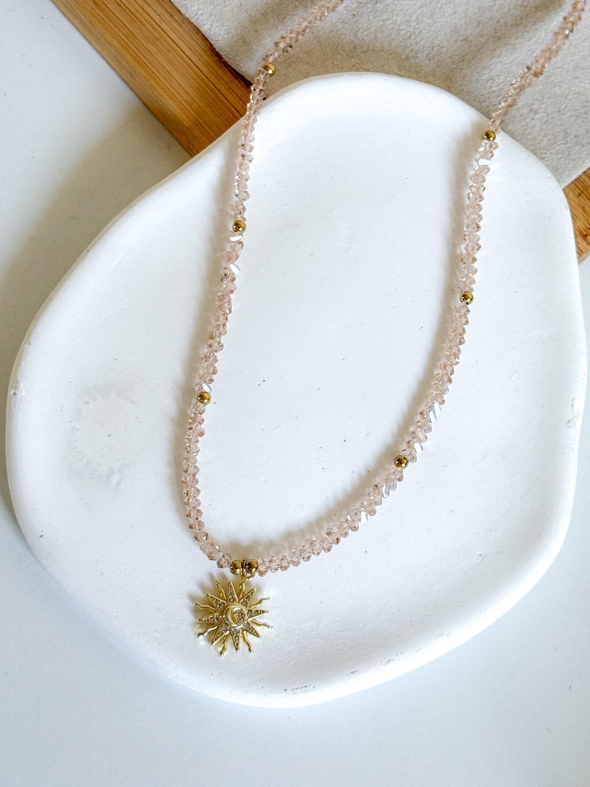 Naszyjnik, choker z drobnych koralików w kolorze szampańskim, z zawieszką słońcem w cyrkoniach. Oprawa w kolorze złotym.
