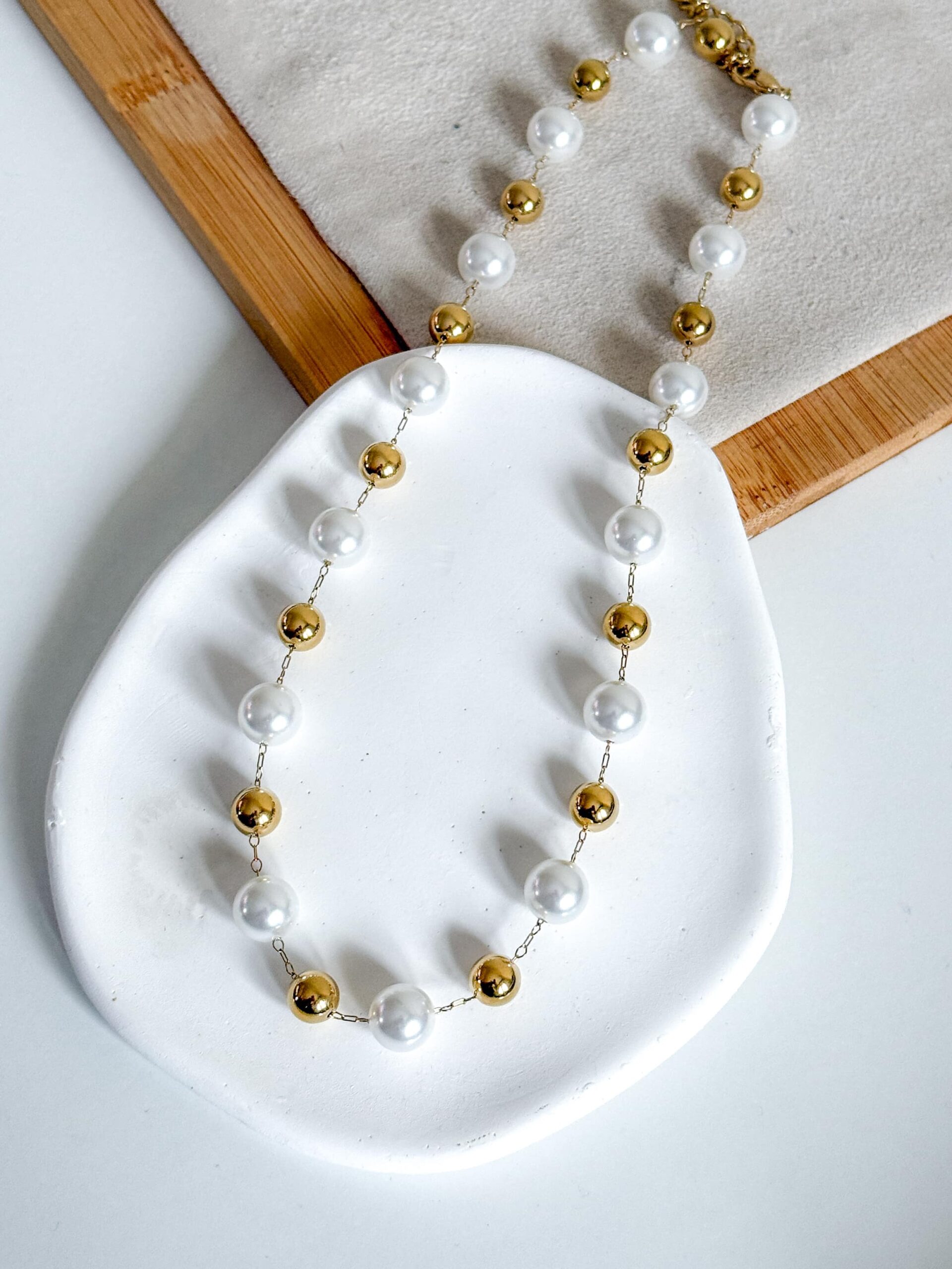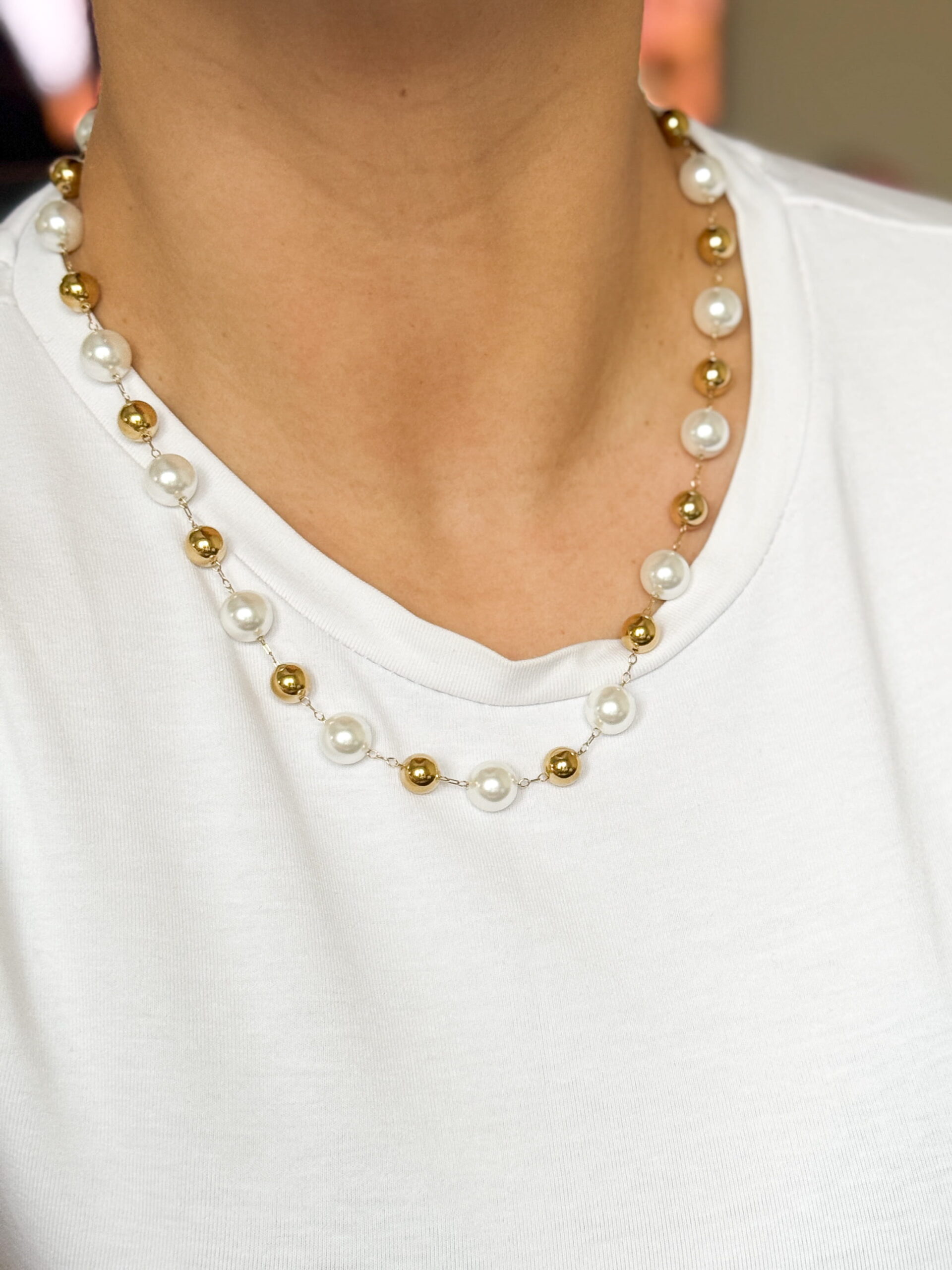 Naszyjnik z dużych pereł i złotych kulek. Oprawa w kolorze złotym.