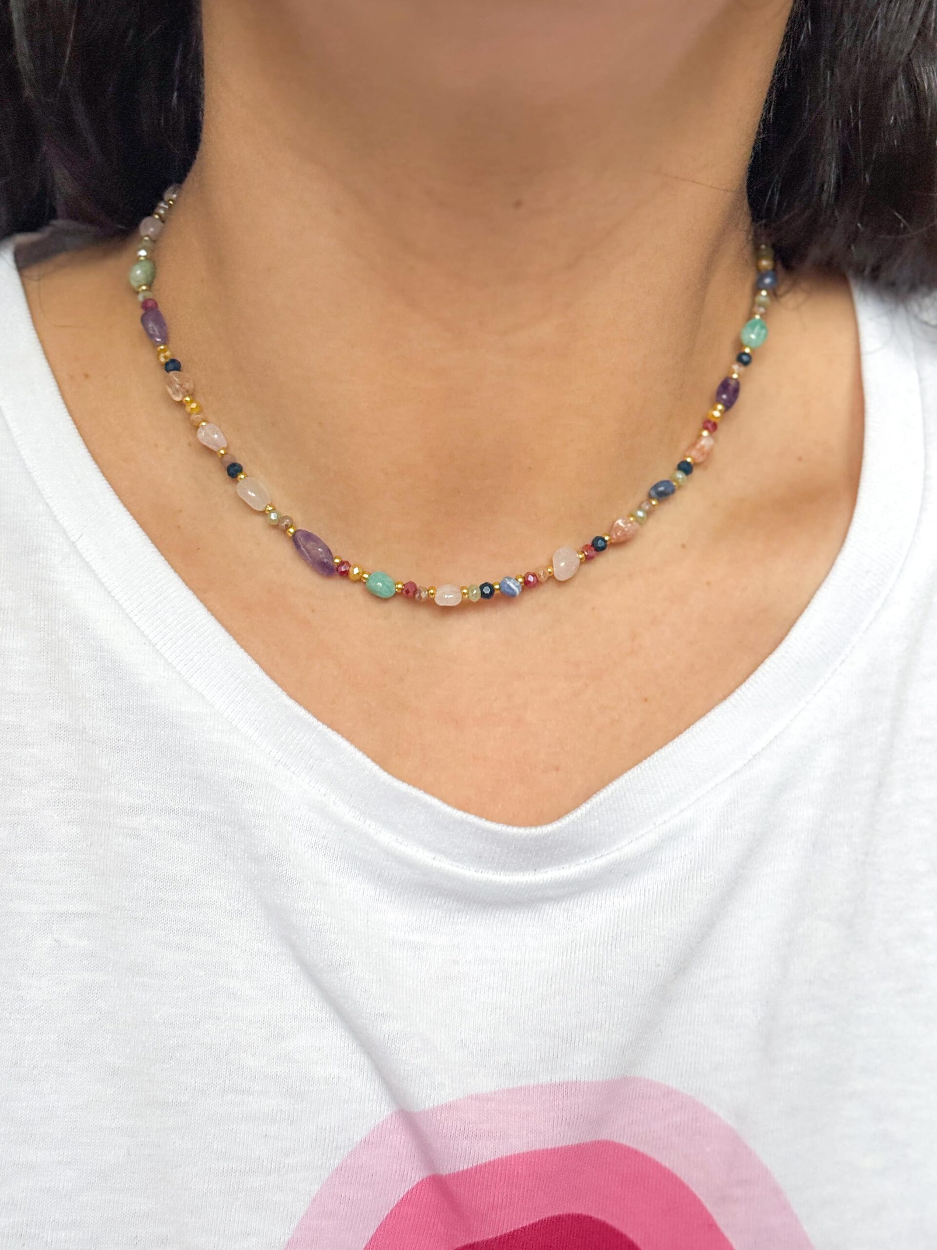Naszyjnik kamienie nieregularne ametyst fluoryt kwarc