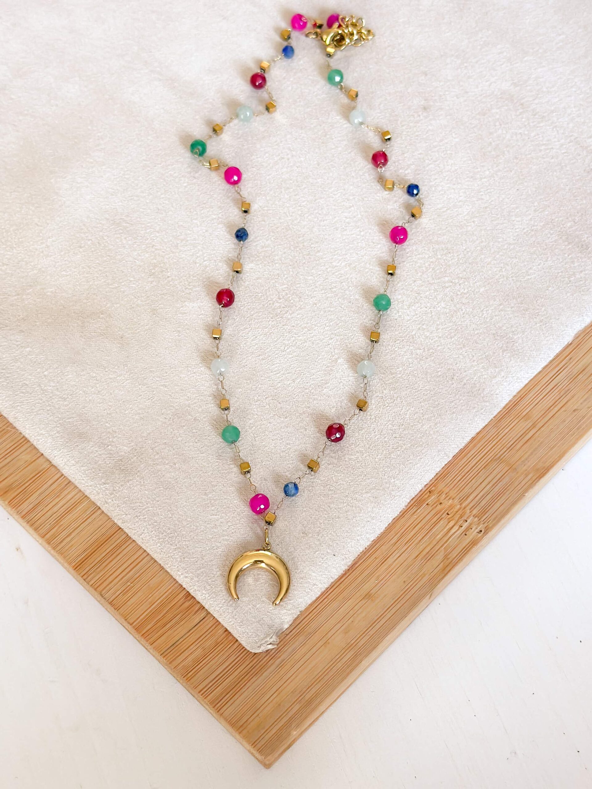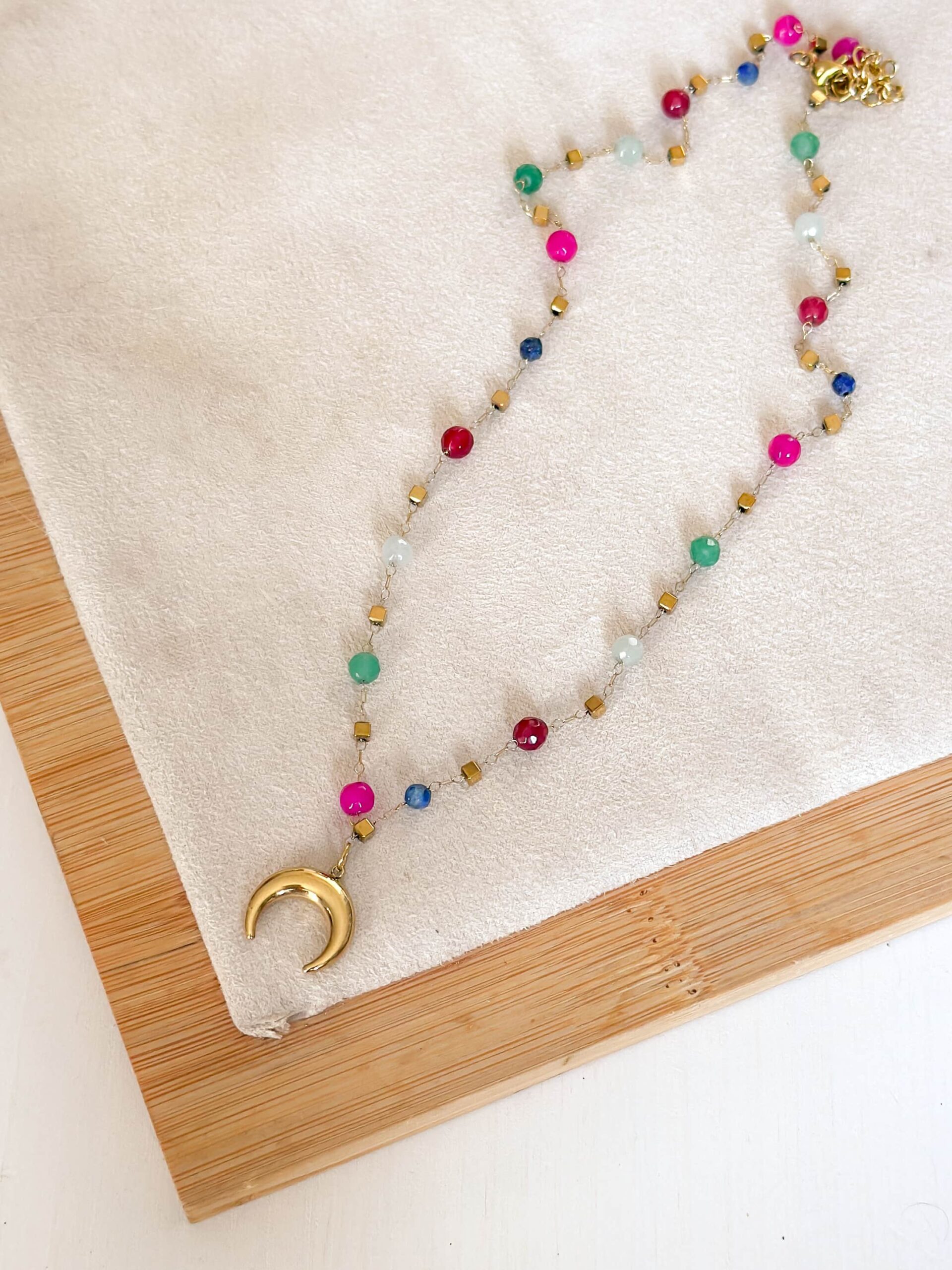 Naszyjnik z dodatkiem kamieni kolorowych jadeitów w odcieniach fuksji, zieleni, bieli, granatu i złotych kostek z zawieszką księżycem w kolorze złotym. Zapięcie na karabińczyk.