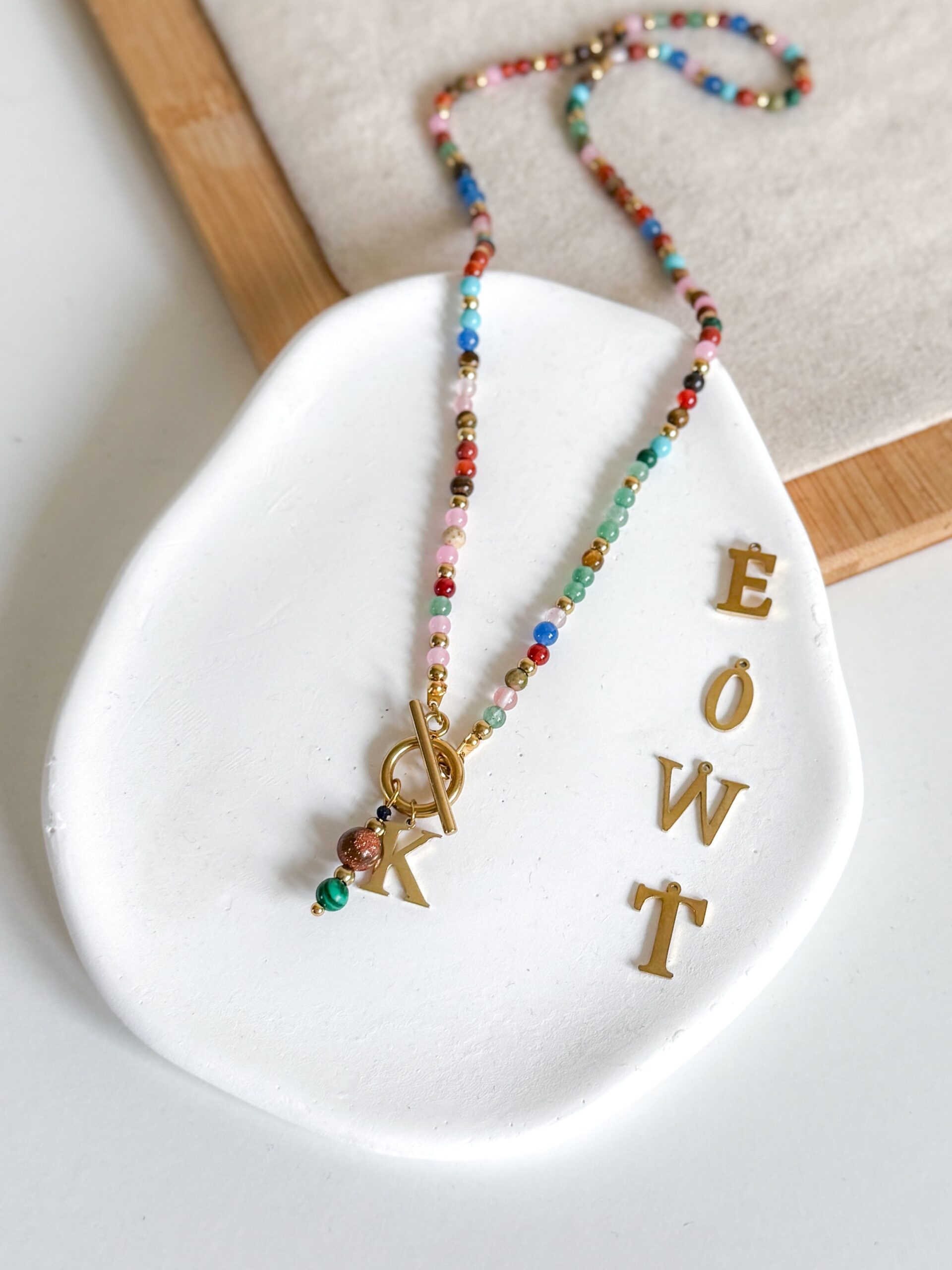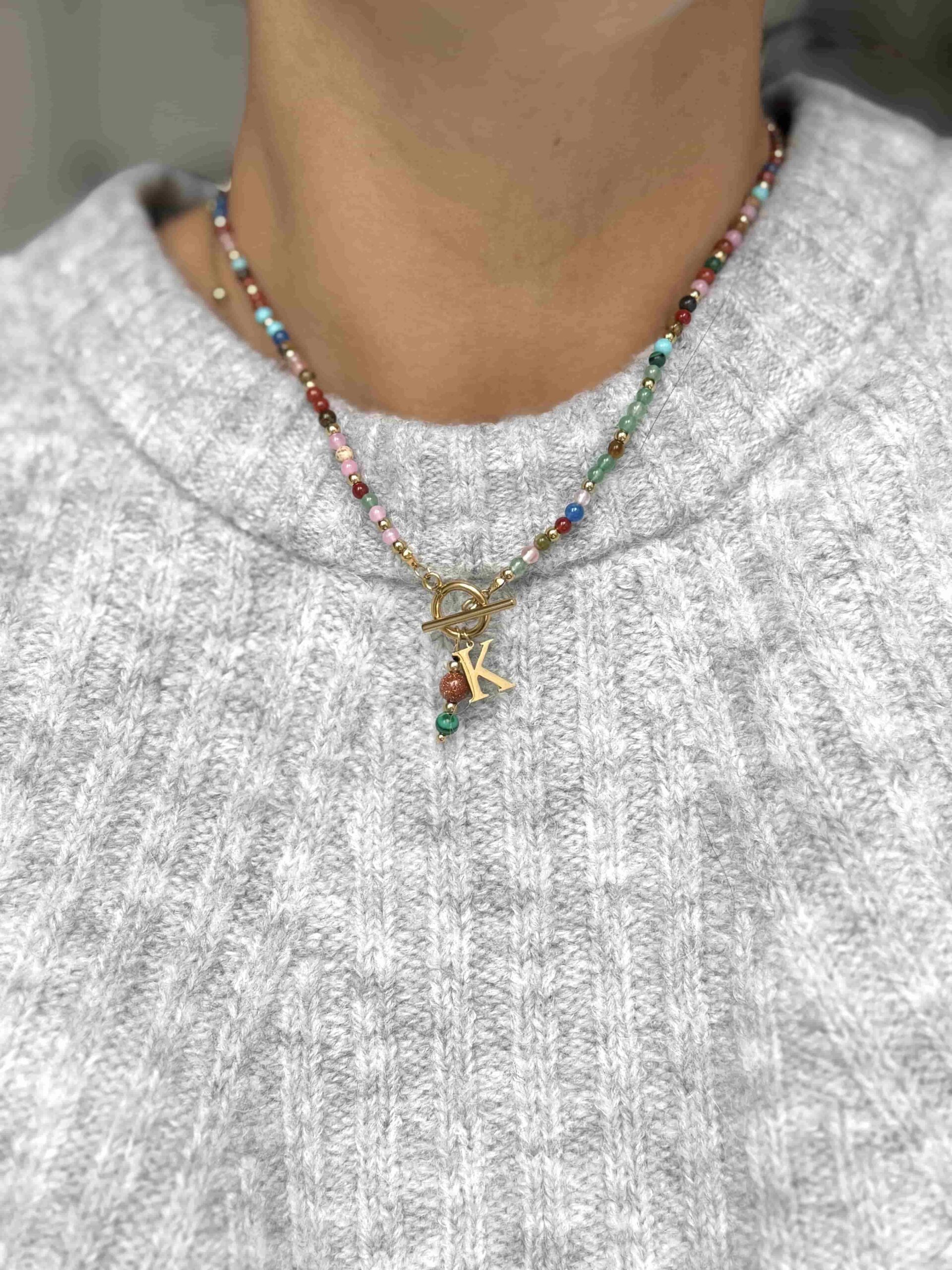 Naszyjnik z kamieni w jesiennych kolorach m.in. jadeit, malachit, fluoryt, turkus, tygrysie oko z dodatkową zawieszką z malachitu i piasku pustyni, a także dowolną literą (proszę w uwagach do zamówienia wpisać literę). Oprawa w kolorze złotym.