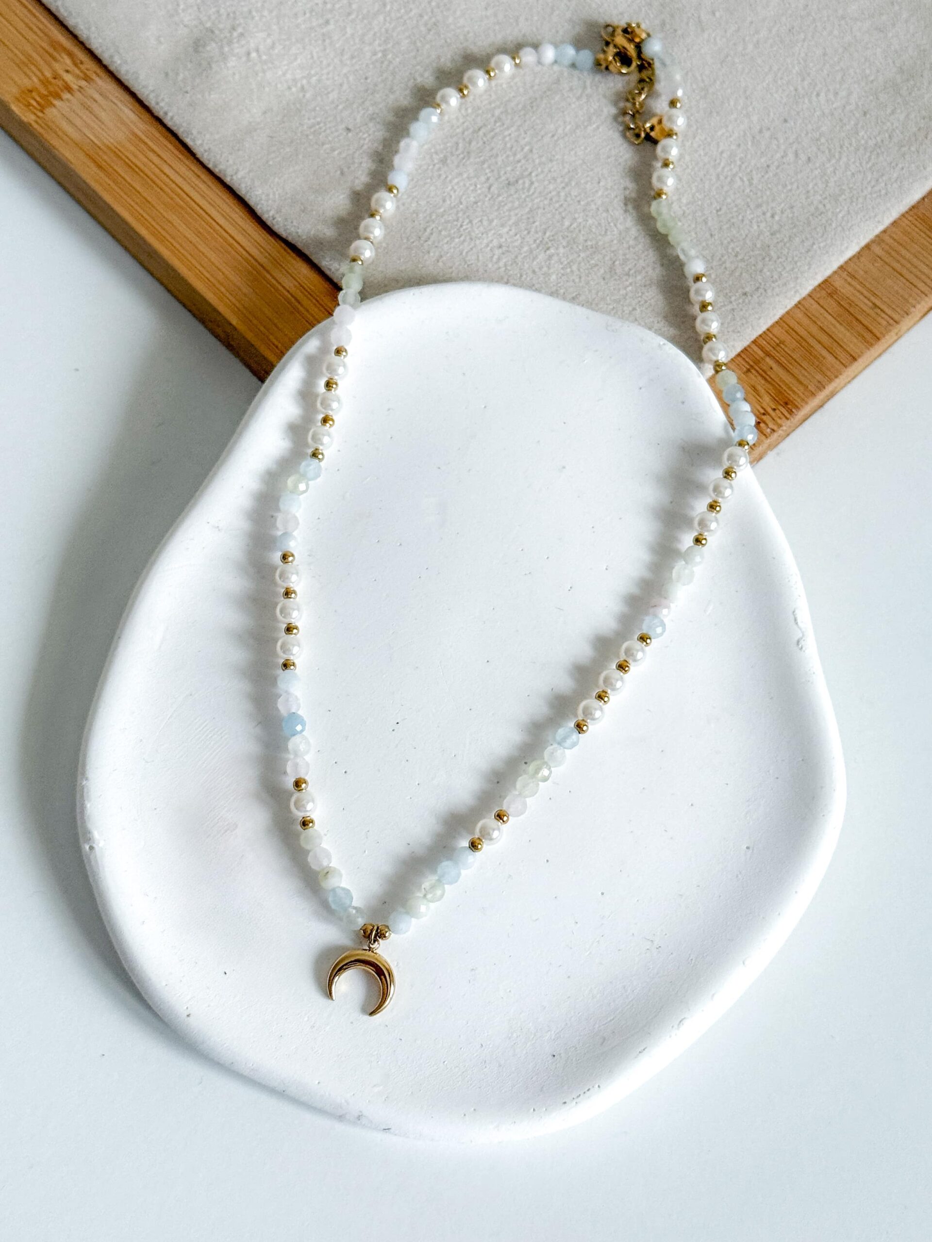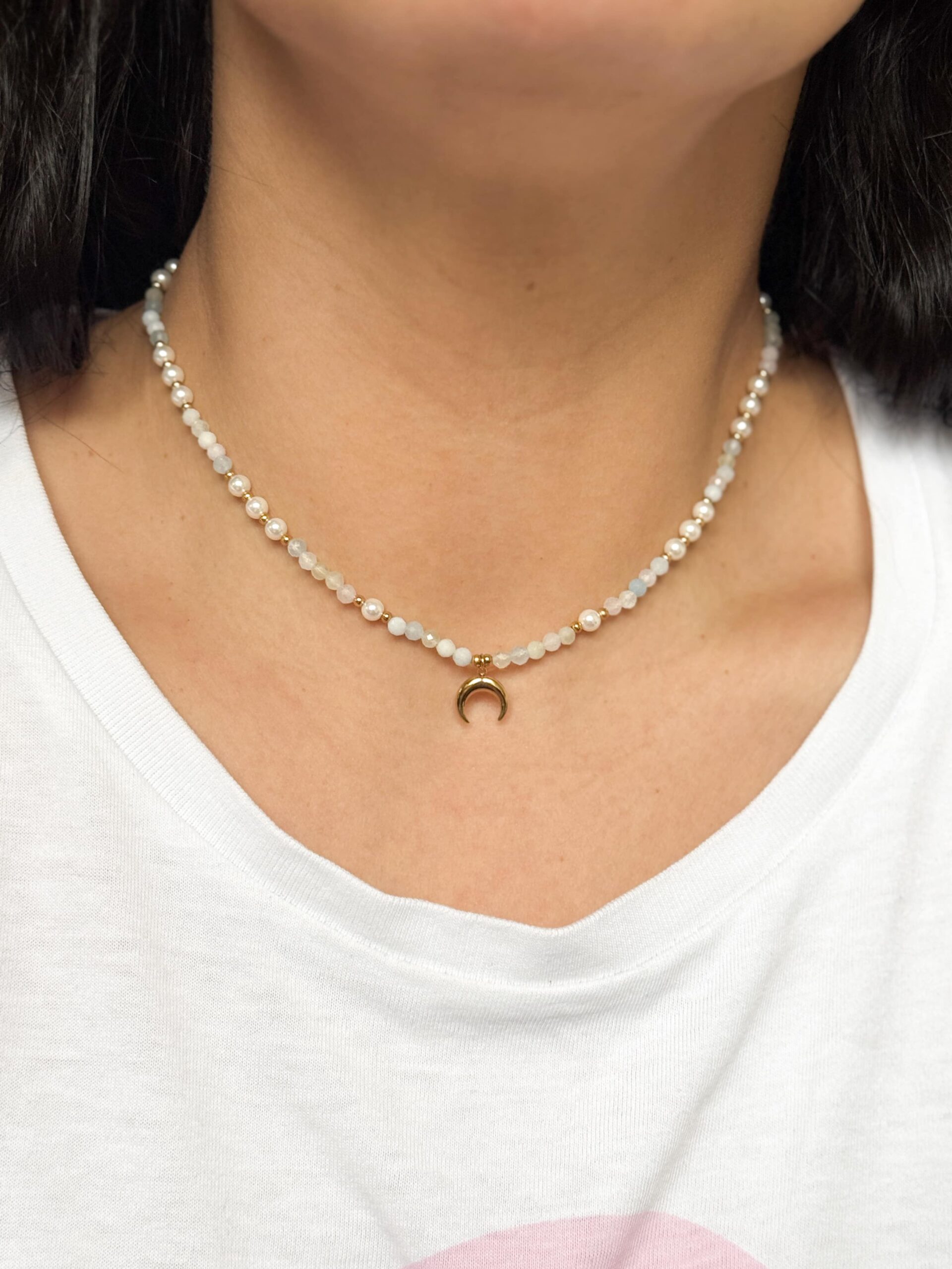 Naszyjnik, choker z kamieni naturalnych fasetowanych i pereł syntetycznych z zawieszką księżycem. Oprawa w kolorze złotym.