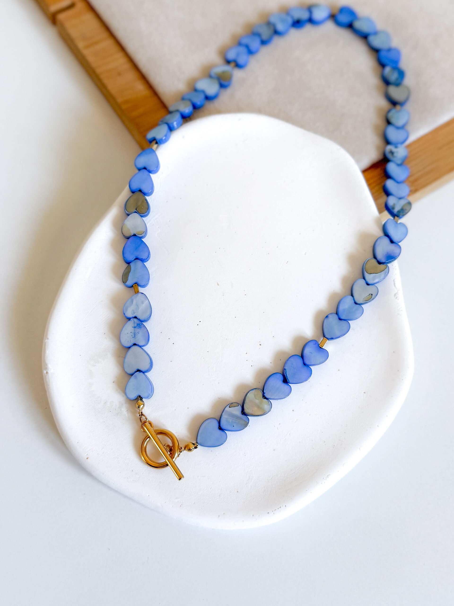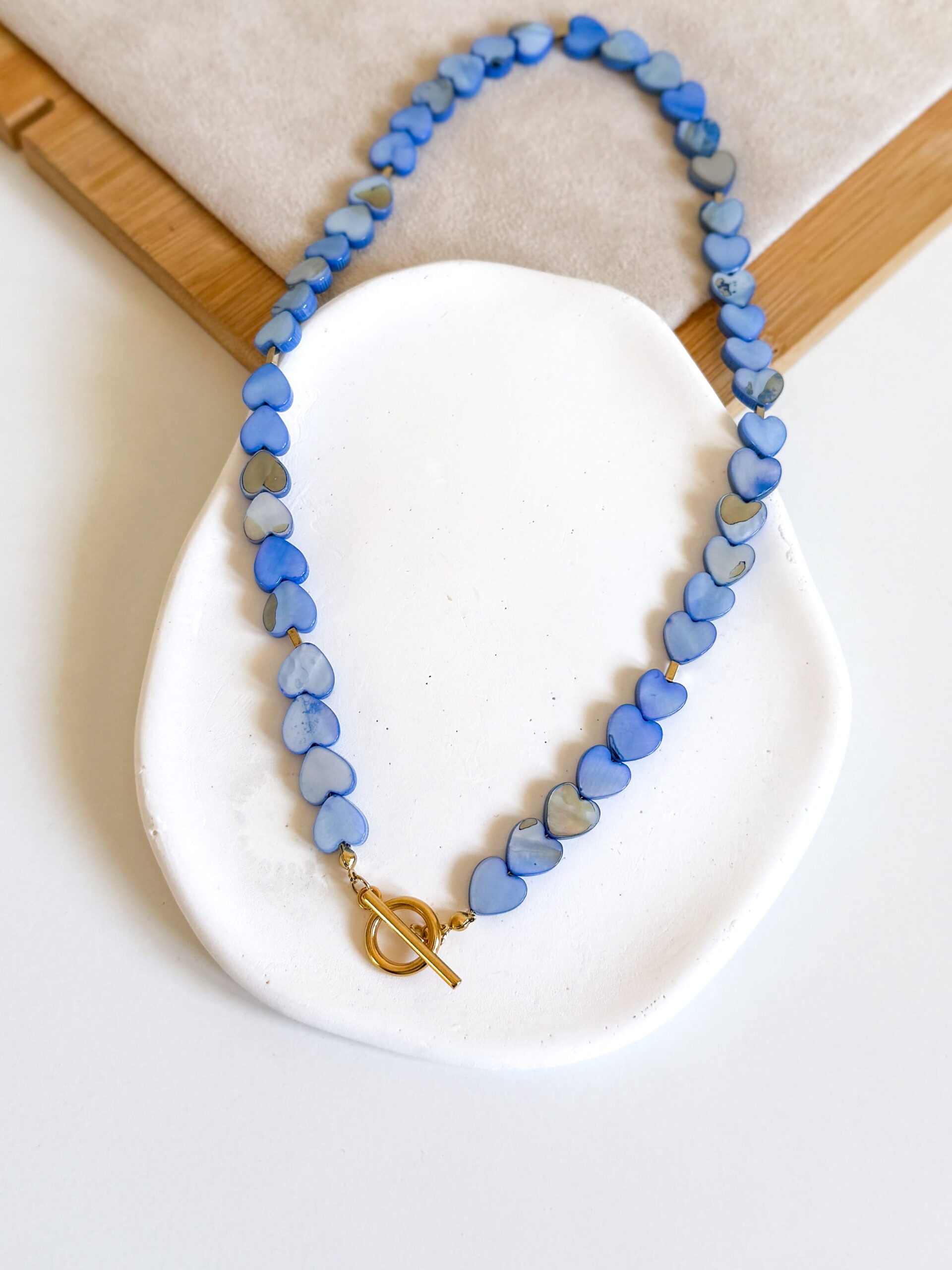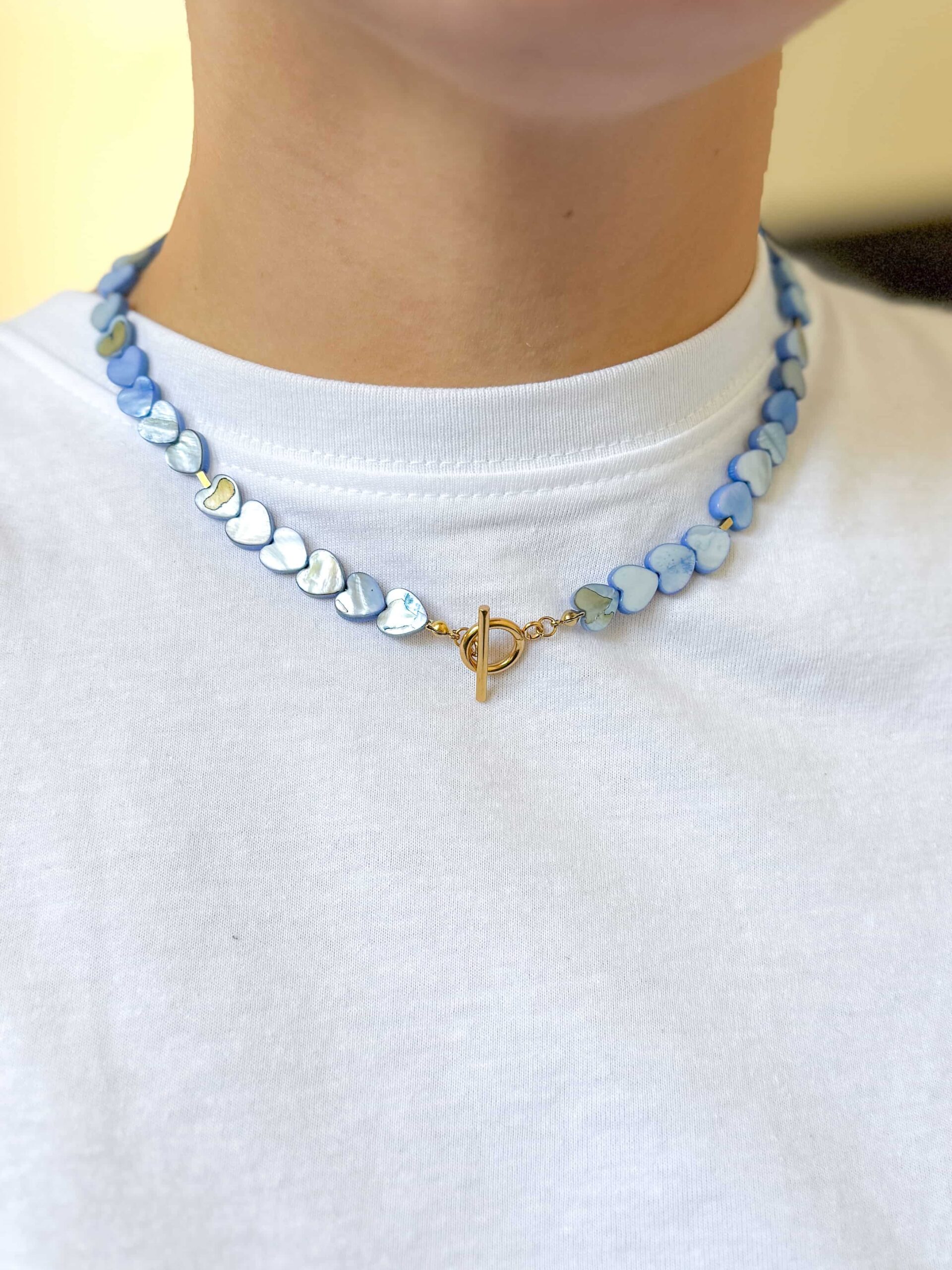 Naszyjnik, choker ręcznie wykonany z chabrowych serc z masy perłowej (barwionych). Oprawa w kolorze złotym.