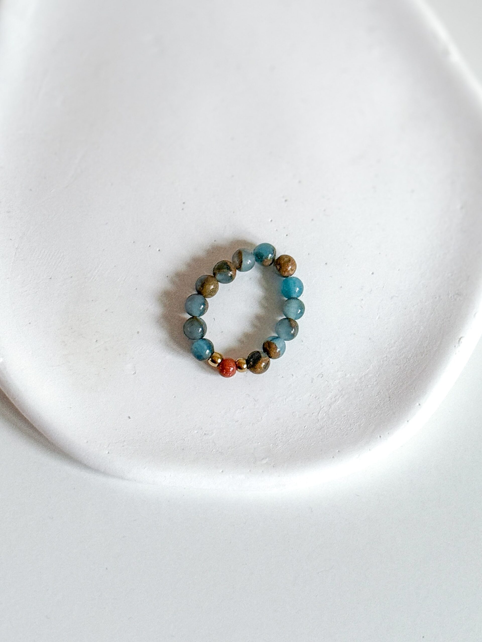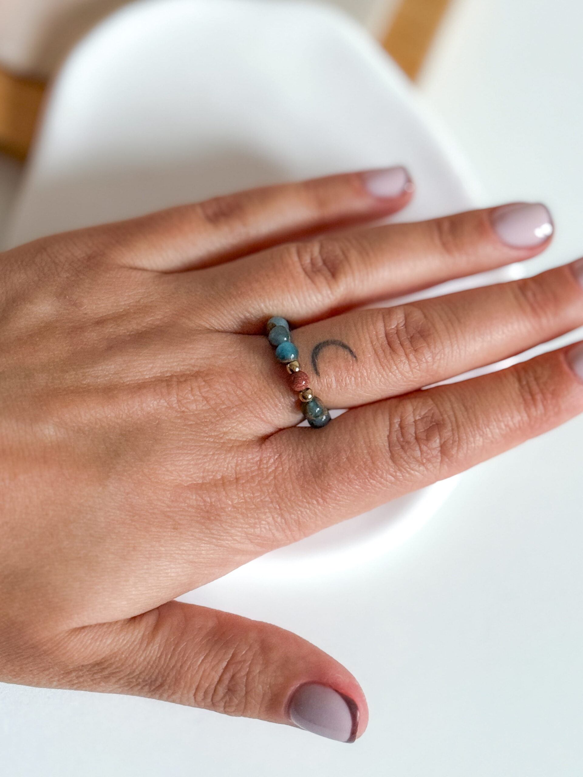 Pierścionek ręcznie wykonany z kamieni jaspisu jesiennego i jednego kamyka piasek pustyni i złotych kulek na gumce.